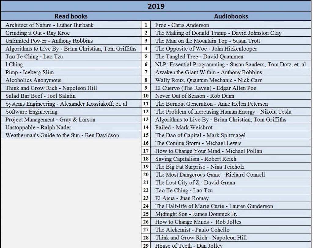 A goal for 2020 is to read 36 books and listen to 52 audiobooks. The goal is to read one informational, one inspirational and one fictional book each month to balance my creativity and logic. So, if I read 10% of a book a day and listen to at least one a week during my commute to work. I’m striving to be in that upper echelon 😉